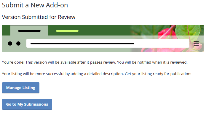 Themes submitted for self-distribution will be signed immediately and an XPI file will be generated for download.