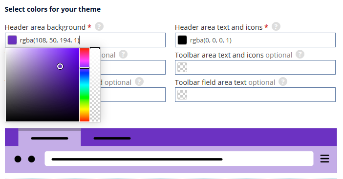 Color values can be entered using hex, rgb, or rgba. You can also use the color selector to pick the colors for your theme: